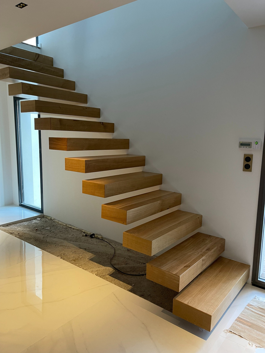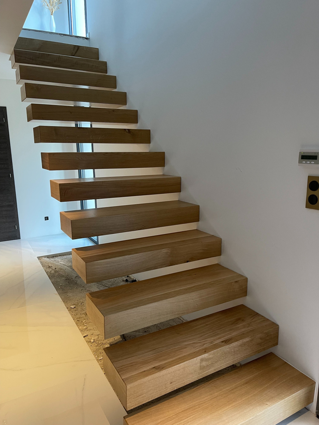 Fabrication d’un escalier suspendu en chêne massif.